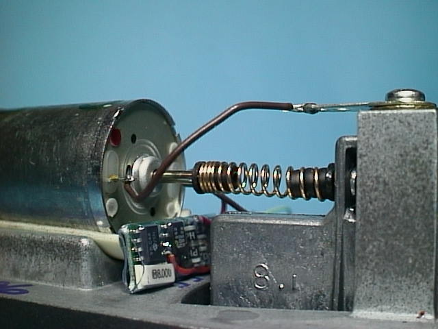 Note that one of the IMPORTANT things to do when installing a decoder in this locomotive is to replace the light bulb supplied by the manufacturer with a much lower current draw bulb. The light bulb supplied by the manufacturer is a high current draw bulb, and use of it with a decoder WILL burn out the decoder function lead. We have had good luck using a Miniatronics 16VDC bulb which draws a mere 30mA. These are available in packages of 10 (#18-016-10) or 20 (#18-016-20) at a very reasonable price. You can simply remove the entire light bracket & bulb from the chassis, and replace it with the Miniatronics bulb, taping the bulb in place in the shell with electrical tape, or using hot glue. Some folks prefer to use a small piece of brass tubing to surround the bulb to dissipate the heat. Also it is highly recommended that you DO NOT run this loco on a DCC layout without replacing the a bulb, even if you have not installed a decoder. The light bulb used by the manufacturer generates a lot of heat, and since the loco sees full voltage from the track, the bulb will get very hot and melt the plastic shell! Here's is a picture of the LE130 installation: Here's a picture showing how the NCE N103 decoder might be placed in the loco.