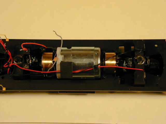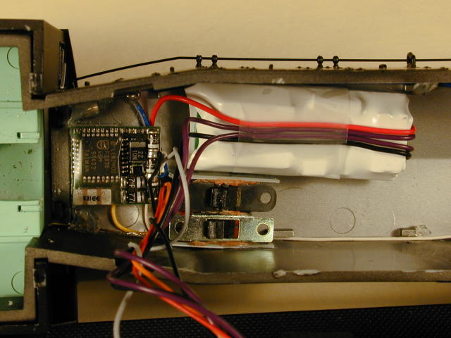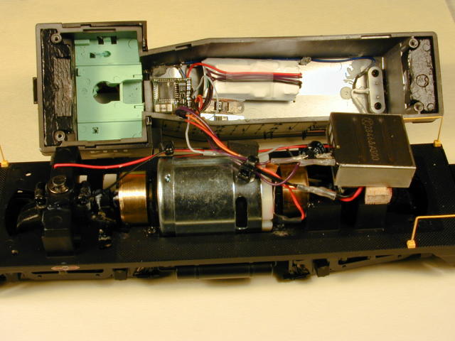 Once installed, the decoders' addresses would be set up to allow them to operate as a single unit on the layout. Each of us used slightly different installation techniques with these components. Our approaches are described below. As with most DCC installations there is not one ideal installation. But there are certainly correct and incorrect ways (Letting the smoke out of the decoder is an incorrect installation! :-) If you intend to install DCC+sound in your loco, please read completely through these instructions one or more times before starting the installation so that you have a complete understanding. Here's a picture of the SW-1 before we started the conversion. The picture after conversion looks exactly the same as we made NO exterior modifications to the shell or locomotive. In order to get started we had to following the normal process outlined above: remove the shell, and then unplug and remove the e-unit. In this next picture you can see the insides of an unmodified SW-1. Note inside the shell you have the E-unit to the left and yellowish colored spring assembly to the right. And of course the PCB on the chassis.